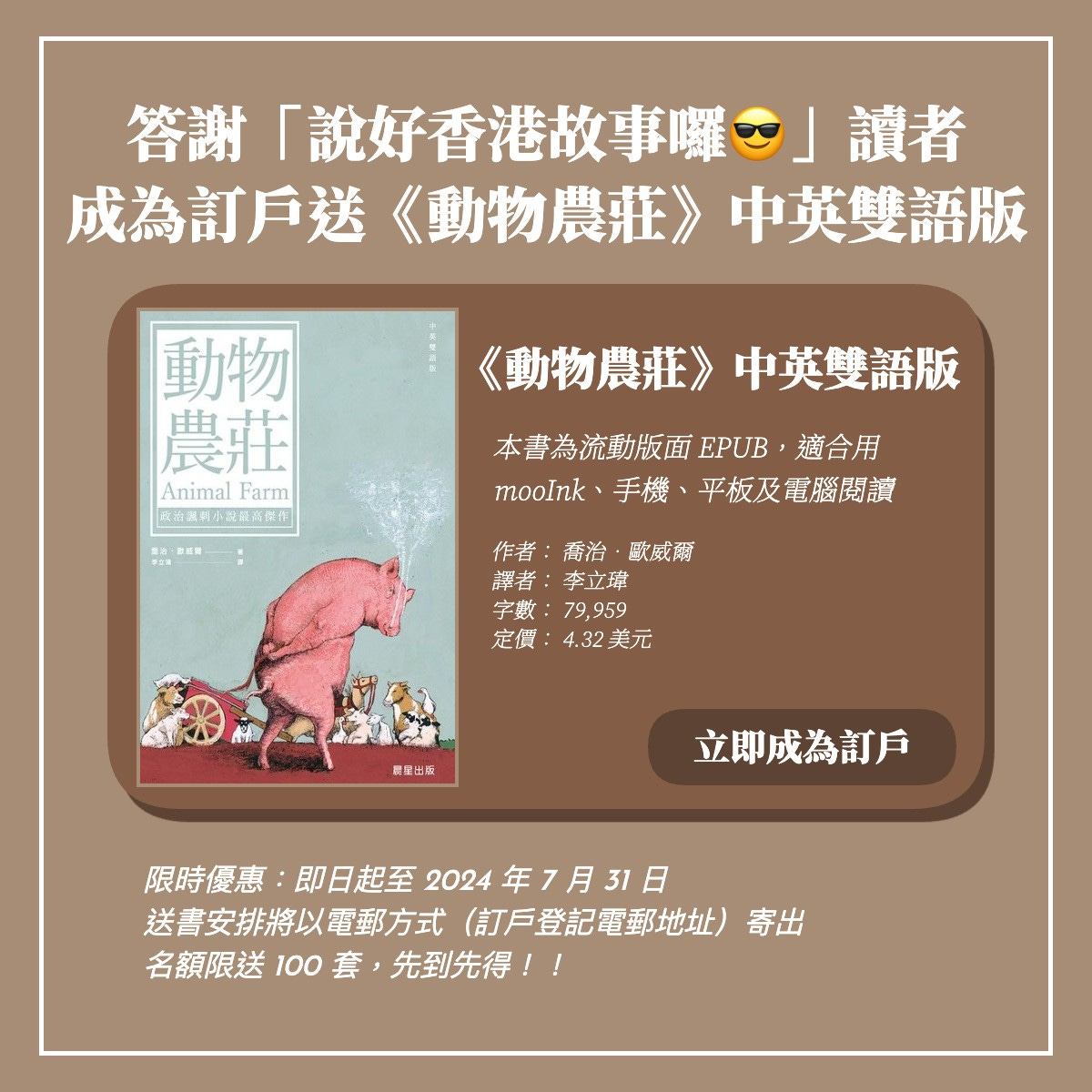 為答謝讀者支持,即日起至 2024 年 7 月 31 日,只要成為月費/年費訂戶,即送《動物農莊(中英雙語版)》電子書!