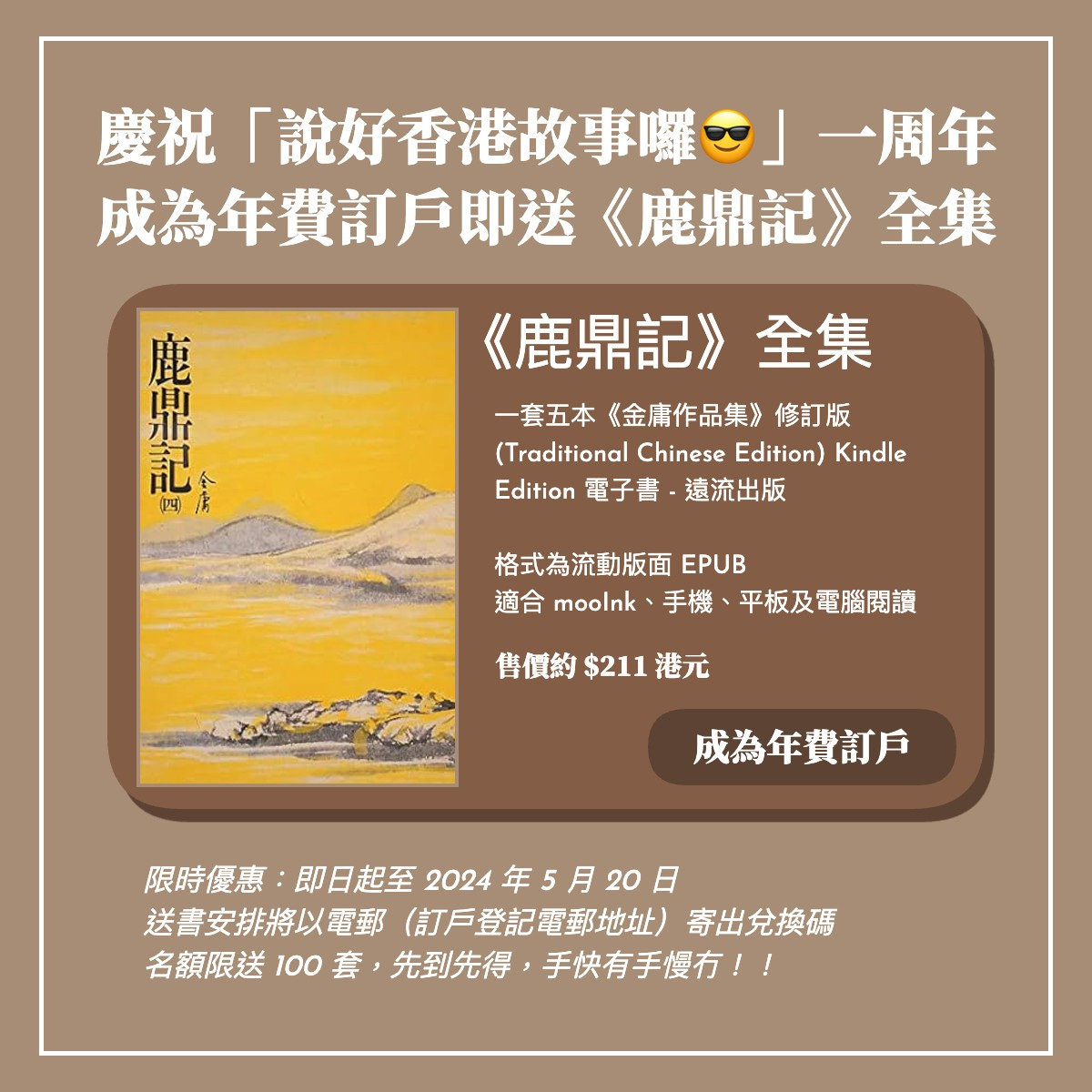 為慶祝「說好香港故事囉😎」一周年,即日起至 2024 年 5 月 20 日,只要成為年費訂戶,即送《鹿鼎記》全集!