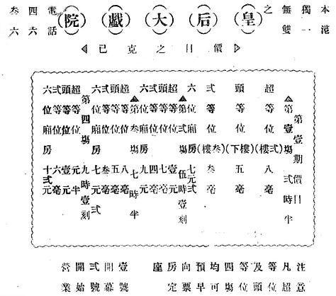 當時戲院設有堂座和樓座,座位共1,200個。票價分四種:最貴的六位廂房晚場票價高達十二元;最便宜的二等位只需三毫,那是足足四十倍的差距。